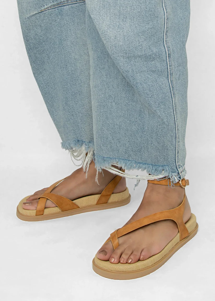 BERRY in Camel is your laid-back essential for sunny days and easy styling. Featuring soft faux suede straps in a warm tan hue and a secure ankle buckle, this sandal brings natural charm to your everyday outfits. A woven-style footbed adds earthy texture, while the cushioned platform sole keeps things comfy from AM to PM.